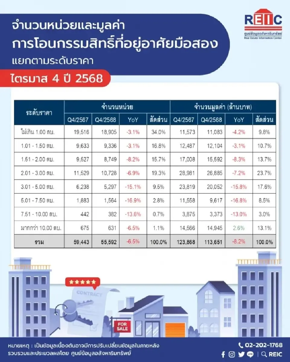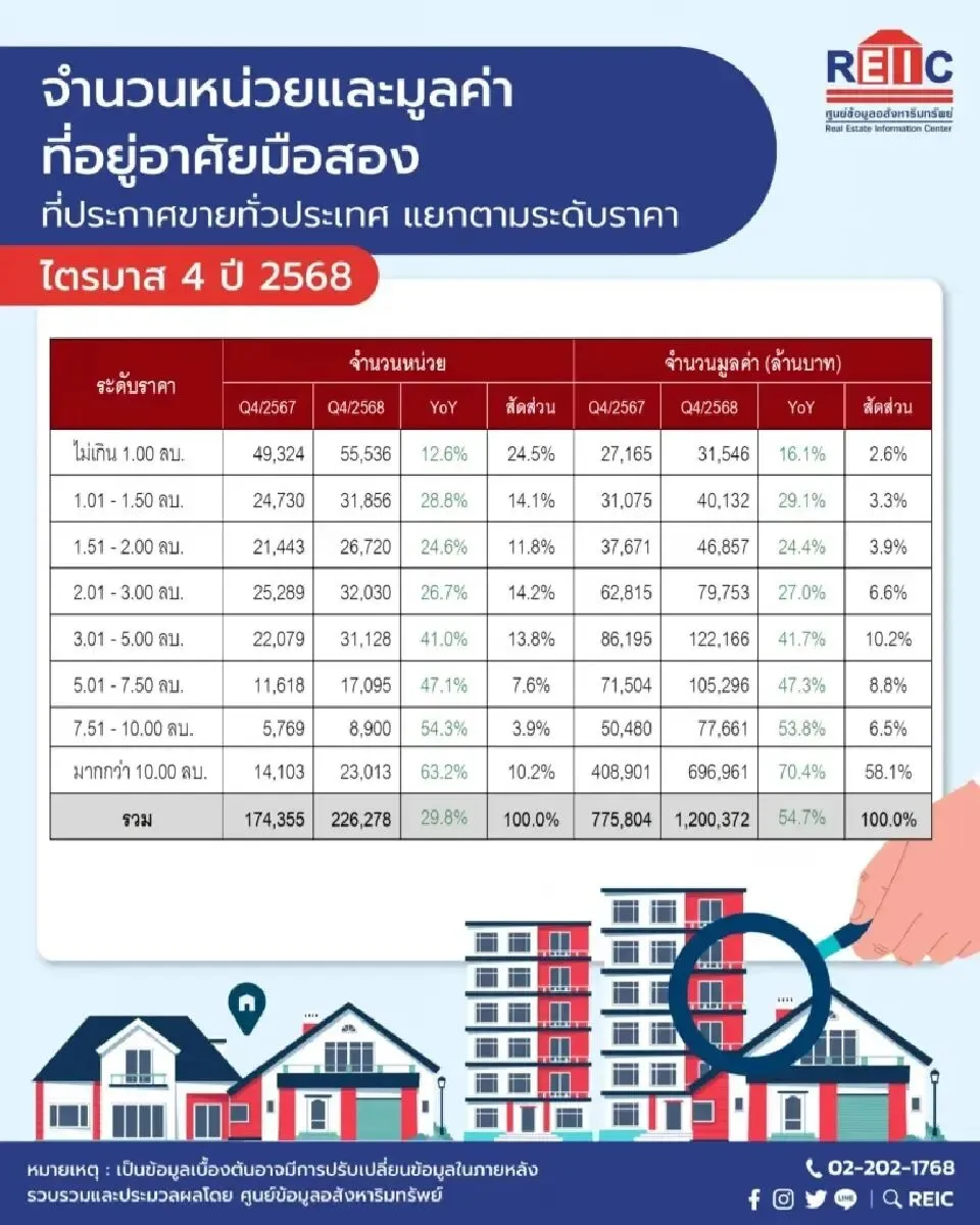 泰国住房公积金银行(GHB)房地产信息中心(REIC)的数据显示,2025年第四季度泰国二手房市场出现了明显的“供应过剩”信号。全国待售二手房数量达到226,278套,同比增长29.8%;总市值飙升至1.2万亿泰铢,增幅高达54.7%。尽管供应端异常活跃,但需求端却表现疲软,同期房产转让量下降了6.5%,转让总额下降了8.2%。尽管独栋别墅仍是市场主流(占40%),但公寓类产品的增长最为惊人,待售数量增长了79.1%,总价值增长了141.7%,反映出市场中存在明显的公寓套现或抛售行为。1000万泰铢以上的高端房产挂牌量大幅增长(+63.2%),显示出豪宅市场的换手频率增加。然而,市场成交的主力军依然是100万泰铢以下的低端房产。曼谷依然是二手房市场的核心,其待售房产数量占全国的31.4%,而价值则占到了全国总量的60.7%。对在泰长期生活、工作及房产投资者的建议与启示