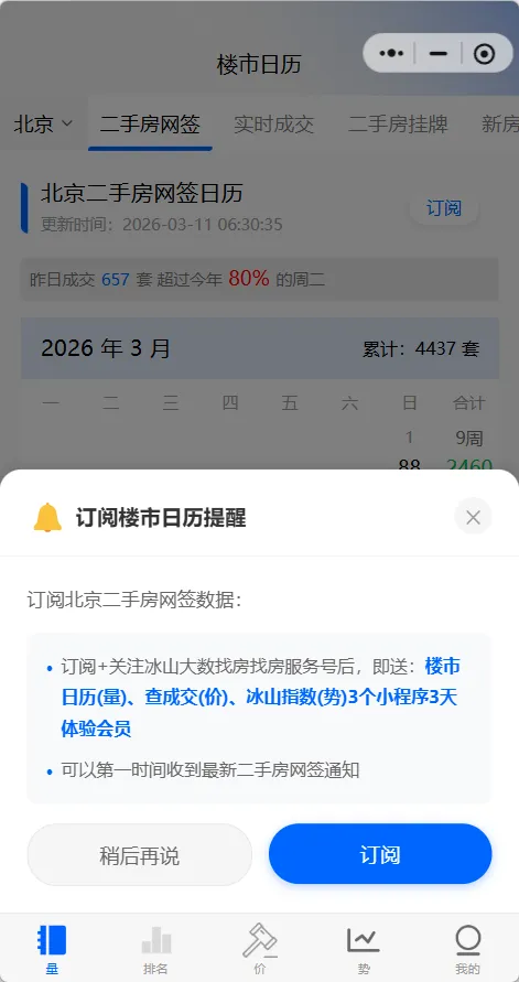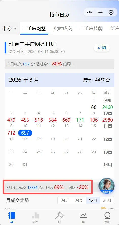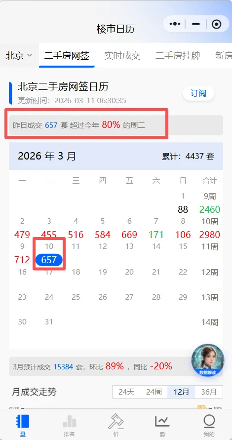 每日网签实时看覆盖北京、上海等 27 城,每天更新二手房网签量。比如北京 3 月 10日成交 657 套,系统会直接告诉你「超过今年 80% 的周二」,让你秒懂当下市场是冷是热。