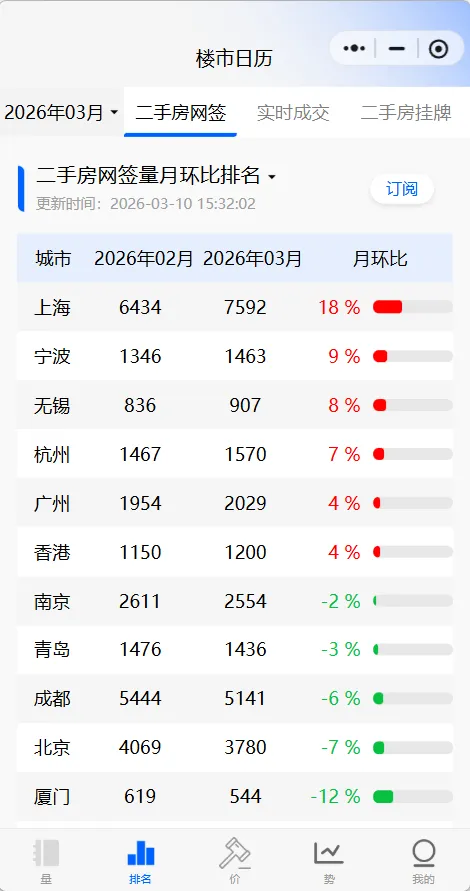 多城环比横向对比想看哪个城市先回暖?直接看「月环比排名」:上海 + 18%、宁波 + 9%、北京 - 7%… 红绿进度条直观展示,城市轮动机会一眼抓牢。