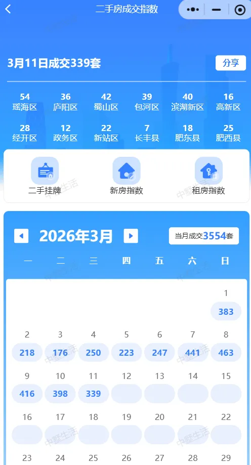 近日,合肥二手房明显有抬头趋势,我们先看几个数据案例:据数据统计,2月份合肥全市二手房卖了3336套,较1月环比下降了34.41%,同比下降25.32%。但成交价在上涨,2月成交均价为12010元/㎡,环比上升5.71%,同比下降16.31%。根据中墅统计,进入3月份以来,尤其是第二周,二手房成交量暴涨,每日均在300+套。并且工作日9-11号三天,成交量也依旧可观,日均在350套左右。而肥西、瑶海、庐阳、政务、长丰、肥东,依旧呈现下跌状态。除了合肥,全国各地也出现了成交量上涨的现象。