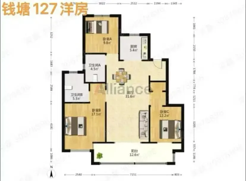 🏆 148㎡大三房两卫,南北通透,格局大气。