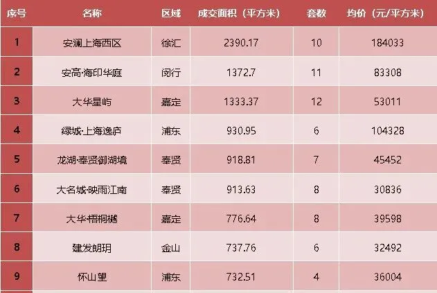 其中,安澜上海以均价18.10万元/平方米成交10套,位列榜首。