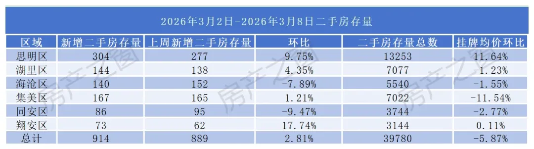 二手房方面,上周(2026.3.2-3.8)厦门新增二手房挂牌914套,环比上涨2.81%。目前全市在售有效二手房总数39780套,其中思明区13253套、湖里区7077套,岛内合计超过2万套,占据半壁江山;岛外则呈现海沧、集美库存集中,同安、翔安相对分散的格局。