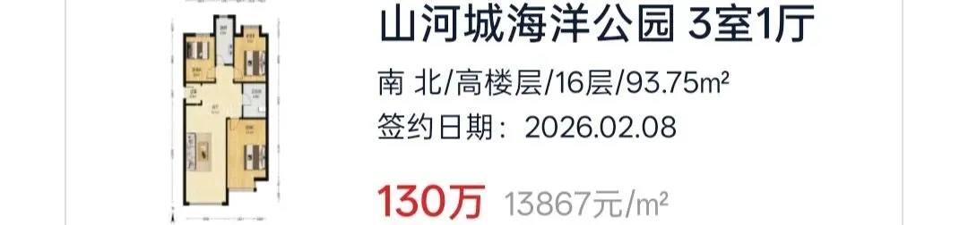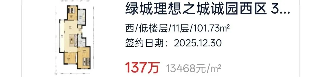 ,在2020年的二手房价格达到了2.8万左右一屏,但是进入2026年二手房的成交价,跌倒了1.3万左右。