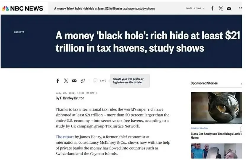 根据税收正义网络的一项报告,截至2010年底,全球超级富豪在离岸天堂至少隐藏了21 万亿美元~32万亿美元的财富(仅金融资产),相当于美国和日本的GDP总和,“这是世界经济中的一个巨大黑洞”。