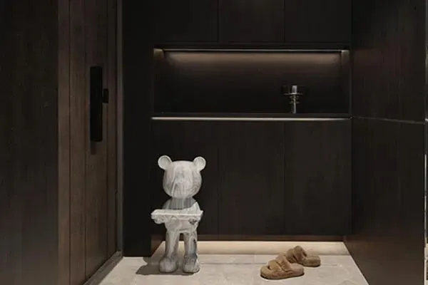 从上海的市中心人民广场,搭乘地铁,近10分钟,就来到了位于静安寺附近的Cara的家了。他们的家,地理位置绝好,周边CBD相连,小区成熟,交通便利了。我们送上了新鲜的水果,开始了探访。首先,闯入视野的是一处简洁硬朗的玄关。玄关,家的开篇序章,它牵引着脚步,也从外部的公共空间,引入了内部的私密空间,它是不落幕的序言,玄关的重要性也溢于言表了。而设计师Roy采用了简练的胡桃木,作为橱柜,密合墙壁,邂逅天花,勾勒造境了。在橱柜的中部,采用了镂空的方式,可以放置一些杂物,而整个橱柜满足了Cara夫妻二人收纳杂物的需求。在一旁,设计师Roy饶有意趣的放置了一个暴力熊的玩具,让整个玄关也兼具了可爱潮玩的气息了。不要小看了这一处玄关,它为Cara夫妻二人的寻常生活里,平添了些许的诗意与浪漫的仪式了。这仪式在身,仪式也在心了。生活无非出门,归家与居家,而这一处雅致的玄关,让Cara对家的生活产生了无限的遐想了。