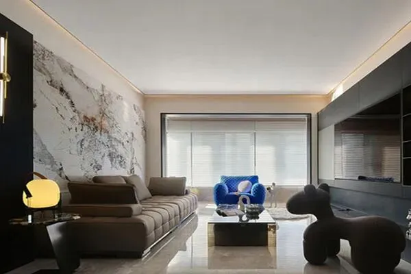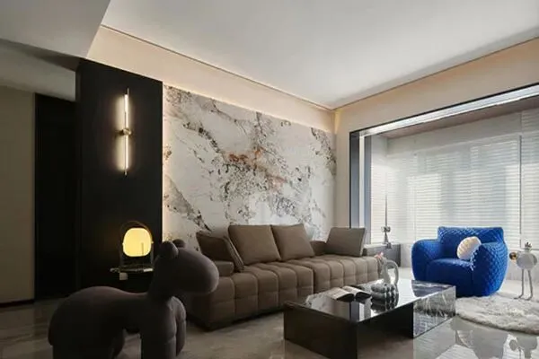 从玄关处,循着流畅的动线,走人了家的内部。第一站,来到了家的中心区域客厅。徐徐步入的时候,就能感受到这间现代感极强的客厅散发出的阵阵吸引力了。设计师Roy以一张优质皮革的米色沙发,与自己自在的大理石茶几,与一张蓝色的沙发椅,和温厚的壁灯,组合成了一处简雅的休息天地了。值得提及的是,这张蓝色的沙发椅,将空间原有的色彩打破了,让空间多了几分色彩丰富感。而沙发背景墙则是一面纹理均衡的大理石,绕显出大气磅礴的气韵。在这间面积适中的客厅里,家具之间预留了足够的步距,它们张弛有度,疏密有间,在有限的空间里,彰显出设计的善意来。与此同时,客厅空间释放出多种的生活场景,无论是在这里看看电视,还是在这里闲聊几句,都是夫妻二人尚好的选择了。整间客厅,流淌出精美的质感,书写了家的舒适韵味,也淬炼出家的一派风韵。