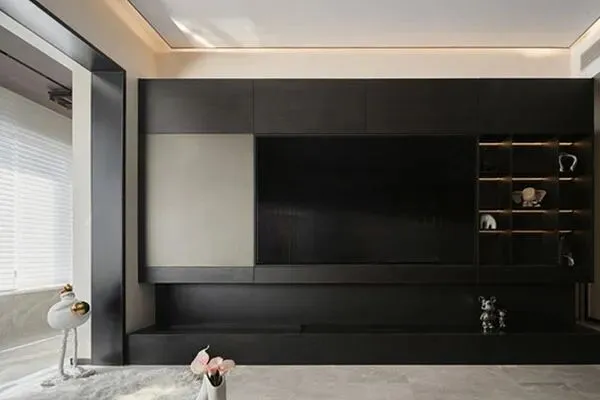 在客厅里落座了,顿时间,一面视觉冲击力极强的电视机背景墙,渗入视线了。设计师Roy在此,以暗黑色的胡桃木作为材料,将黑色的电视机嵌入其中。一侧则是内置灯带的陈列柜。可以说,这黑色是电视机背景墙的主色调,黑色寓意着冷峻,理智,低调,且优雅了。这一面电视机背景墙,它彰显出时尚与摩登的气息,在大气之中,不乏灵韵。而一侧的陈列柜里,是Cara夫妻二人的收藏品。弗洛伊德说:“我时刻要拥有我的收藏品,收藏是人类最为满意的行为,它让生活有了秩序感,纪律感和掌控感。”整面墙面,弥散出经典的韵味,也是家又一处靓丽的风景,同时,续写了家的高级感,将家的人文雅奢的气韵流露而出了。毋庸赘言,它是家里一个精妙一笔,一笔生花,不只符号了。