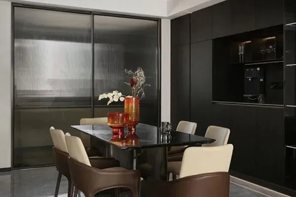 移步到了餐厅空间。餐厅的面积适中,设计师Roy在此也将他的匠心展现无疑了。依旧承袭了空间黑色的调性,一张纹理细致的黑色大理石餐桌,与六张温存的皮革餐椅,与一套餐边柜,组合成了这一处典雅的用餐氛围了。有趣的是,这张餐桌,采用了高科技的技术,使得它不仅接受了圆角处理,还具备了高效保温的功能。然而,餐桌上的琉璃制品与餐具,把餐厅点缀得更具澹雅气韵。整间餐厅里,端庄且朴实,淡雅且灵动。当有三五好友来家聚会,餐厅里,人们飞觥献斝,推杯换盏,让人尽享人间美事,而餐厅也绕具了现代社交的功能了。家的精美之处,也在此娓娓道来了。