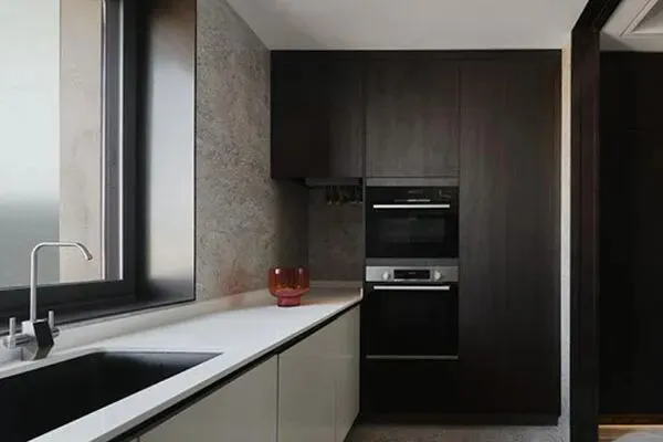 稍走几步,来到了厨房空间。这间厨房面积不大,作为家的烟火聚集地,设计师Roy以一字型作为均衡的结构,将所有的智能厨电嵌入橱柜之中。身处其中,丝毫感受不到什么拥挤,有的是一种便利与简约感。Cara夫妻二人,在这里,为一天的生活开始烹饪早餐,他们就在乐享着城市生活的各种滋味了。厨房里,也洋溢着现代都市生活的乐趣与雅致。厨房,这家里最接地气的地方,如人们所熟知的那样,四方来食。无非一碗人间烟火了。这个精巧的厨房里,将生活的婧雅与美味的美食,巧妙结合了,令人无比惬意,也倍感舒怡了。这里,悄然伫立起家的舒适度,也转译了家的精美质感了。