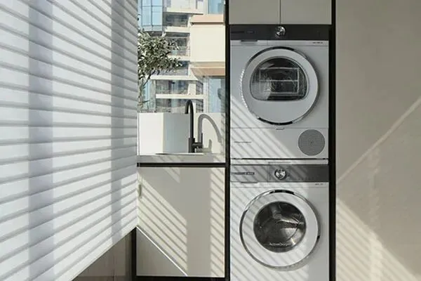 步履不停,来到了家的阳台空间。在这个不算小的阳台上,设计师Roy巧用空间,构筑起一个洗衣的空间。洗衣机与烘干机,垂直而放,而一旁的水池,也与之相呼应了。当日光从窗外轻轻引入室内,而Cara在此洗衣的过程,也变得尤为舒适了,让洗衣与晒衣,成为了一种至臻的享受,一股清新的气韵,在这里升腾了。