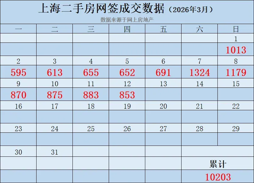 2026年3月上海二手房成交统计:(数据来源网上房地产)