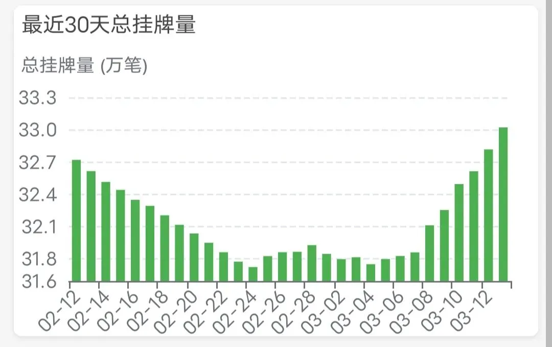 本周工作日已经连续4天成交800+,小阳春叠加新刺激效果不错。2⃣️挂牌量继续上涨📈,已经突破33万笔,目前为330203笔。