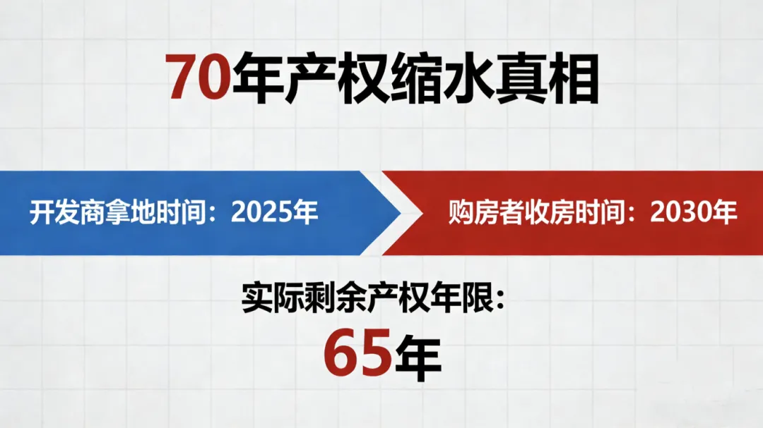 举个例子:开发商2025年拿地囤了5年,2030年交房,你2030年买这套二手房,拿到房本时,产权可能只剩65年甚至更少。