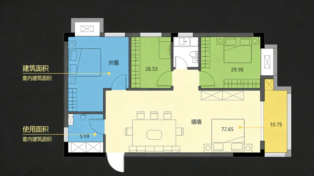 建筑面积:包含公摊(电梯、楼道)、墙体面积,是最“虚”的数字;