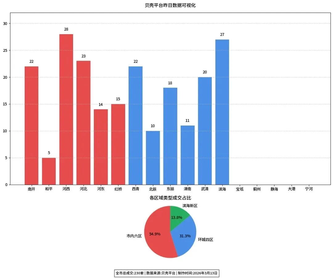 核心区需求坚挺:河西、河北、南开包揽全市前三,说明改善型、学区型需求仍在持续释放,和平区低成交反映核心地段房源稀缺。