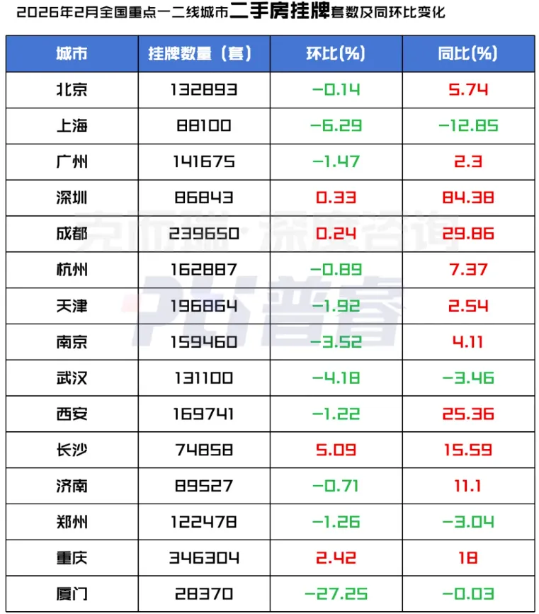 近期全国重点一二线城市二手房市场呈现供给端显著收缩态势。截至2026年2月,15个重点城市中多数挂牌量累计降幅超过15%,上海、北京等核心城市降幅尤为突出。