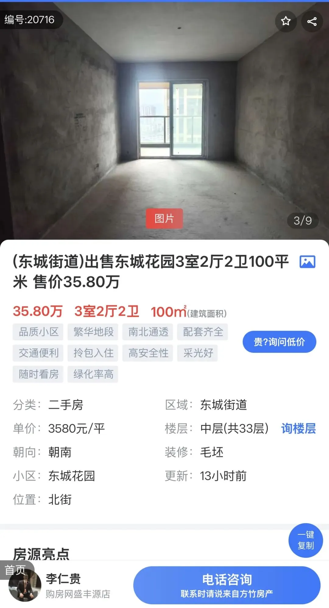 【方竹房产】东城花园清水房出售,三居室35.8万元!