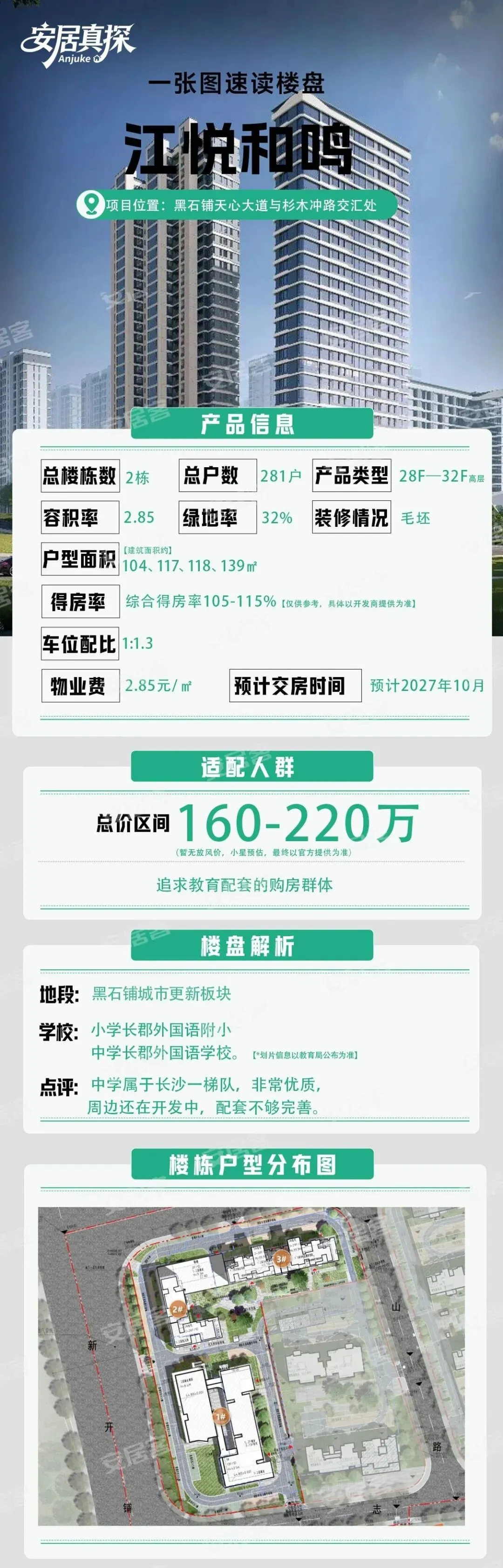 写在正文前:江悦和鸣过于鼎鼎大名,大家对它是又爱又恨,小编仅做客观点评,适不适合你,看完评论区聊。1、最大优势:小学、初中都配套入读,长郡外国语这几年的成绩太惊艳了,拉动房价水涨船高;2、本次产品最小建面104平,显然针对TZ客和只想买房读书的家长;江悦和鸣已经于3月11日开启定存活动,定存开盘享受98折优惠,前100名定存额外优惠5000元,样板间也已开启。首开推3#,共177套房源,主力户型有建面104平(中间户)、117平(东边户)、118平(西边户)户型,其中104和118平户型,5楼以上可以看江(顾问说的,需实地考察)!体量很小。该地块是由商业地改成的住宅地,占地面积不大,只做出来2栋住宅,且不是现在新规常见的板楼,园林应该不会多大,好在户型设计很周正,得房率超高,高点的楼层可以看江。外立面很美。项目立面沿街采用“大面积幕墙 + 简约线条”的公建化组合,简洁挺拔。户型分布上,2#、3# 栋直面湘江,基本无建筑遮挡,算是实打实的一线江景房,不过也有小缺点,楼栋靠近湘江南路,低楼层可能会有一点车流噪音,玻璃隔音好一点就能解决,影响不算大。建面约104平户型,套内使用率105%左右,是性价比最高的户型,适合三口之家。主卧面积有26平,带独立卫浴和衣帽间,小户型也能享大主卧,南向阳台开间6.8米,敲掉墙就能改成大横厅,这应该是目前长沙头部学区房里最低的入手门槛。建面约117平、118平户型,套内使用率都是115%左右,户型设计非常方正,没有太多亮点,也没有大毛病。建面139平户型尚未公布,等有确定版了,群里第一时间发布!买这个盘的人,九成九都是冲着教育来的,实话说,江悦和鸣的教育配套,在长沙现阶段的新房里,几乎没有对手 ——它是目前唯一能配套入读长郡外国语本部的在售新盘,这一点直接把含金量拉满了。