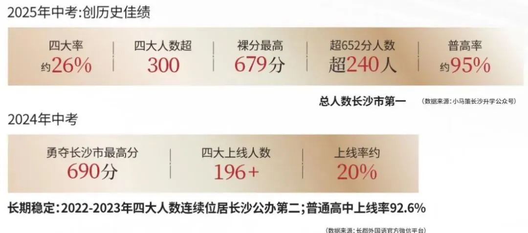 再看最关键的升学成绩,郡外绝对是长沙公办初中里的 “黑马”,成绩一年比一年猛: 2022年首次中考就拿下公办第二,仅次于长郡双语;2022-2024年连续三年四大率超20%,稳稳占据公办第二;2025年直接封神,四大率冲到26%,公办普高率95%,首次超过长郡双语,这个成绩在长沙公办里独一档。更重要的是,郡外的成绩不是靠 “掐尖” 来的,2025 年长沙取消了外国语特色招生,学校初一生源全是配套入学和微机派位,没有择优,即便剔除特色生数据,四大率依然能到 22%,和长郡双语持平。此外,项目还出资改扩建了长郡外国语第一附属小学和中学本部,教育配套只会越来越完善,9 年制一贯制教育,从小学到初中一步到位,不用再为升学折腾,这也是家长们挤破头想进的原因。