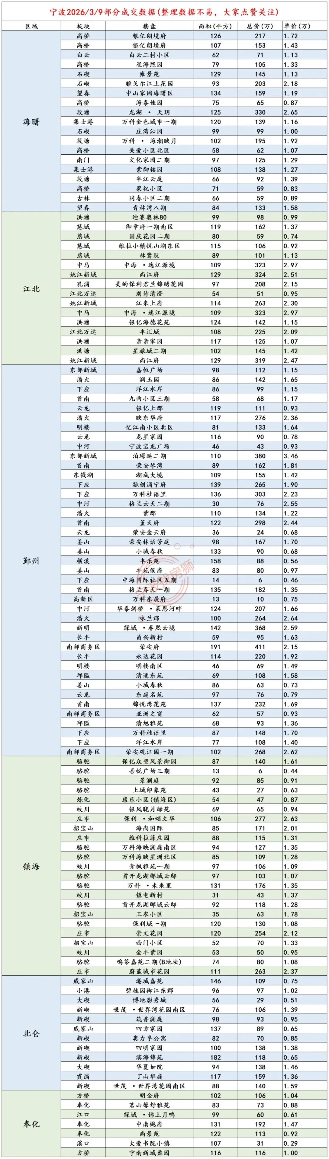 >3月9日宁波二手房成交价格