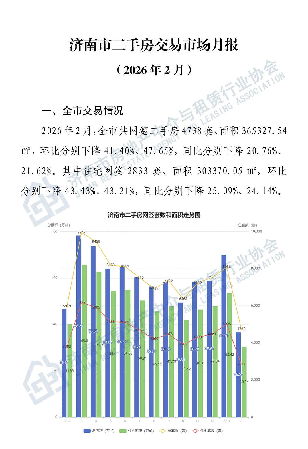 2026年2月,济南市共网签二手房4738套,成交面积365327.54㎡。其中,住宅网签2833套,成交面积303370.05㎡,环比下滑明显。成交量下降主要受春节假期影响,交易周期拉长、看房量减少是主要原因。