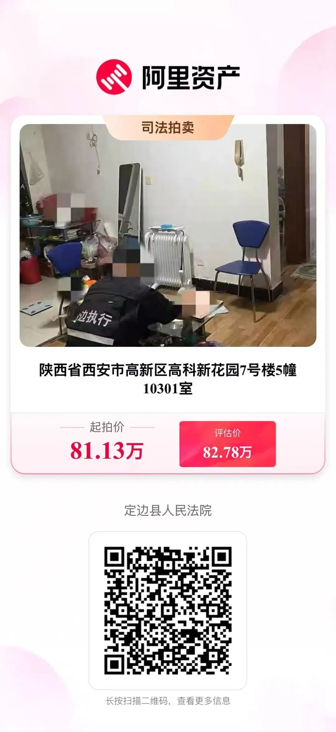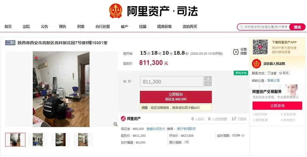 3月29日10时至30日10时,定边法院将在淘宝网司法拍卖平台上,拍卖西安市高新区高科新花园房产,81万元起拍!