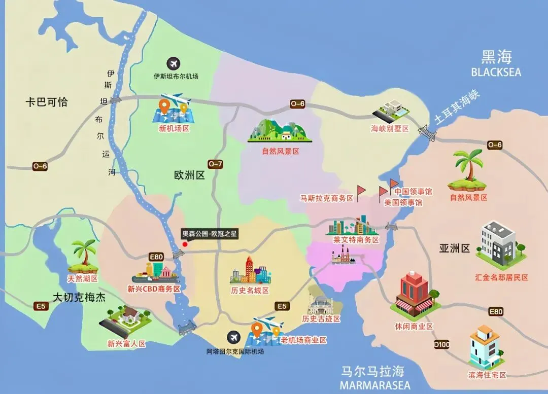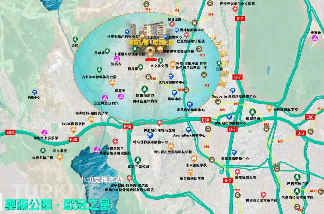 奥森公园·欧冠之星位于伊斯坦布尔富人区——Başakşehir,也是伊斯坦布尔近年来发展最快、规划最先进的区域之一,目前主要居住的人群为本地中产及以上人群,社区环境优越,教育资源优质。