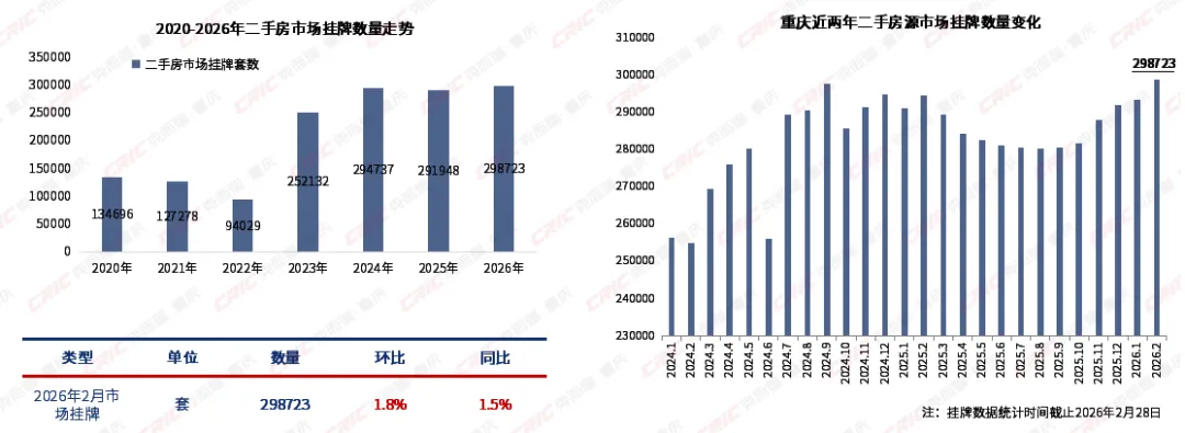 2026年2月重庆二手房源当前挂牌29.8万套,同比涨1.5%,二手房卖方竞争加剧,买方议价权提升。
