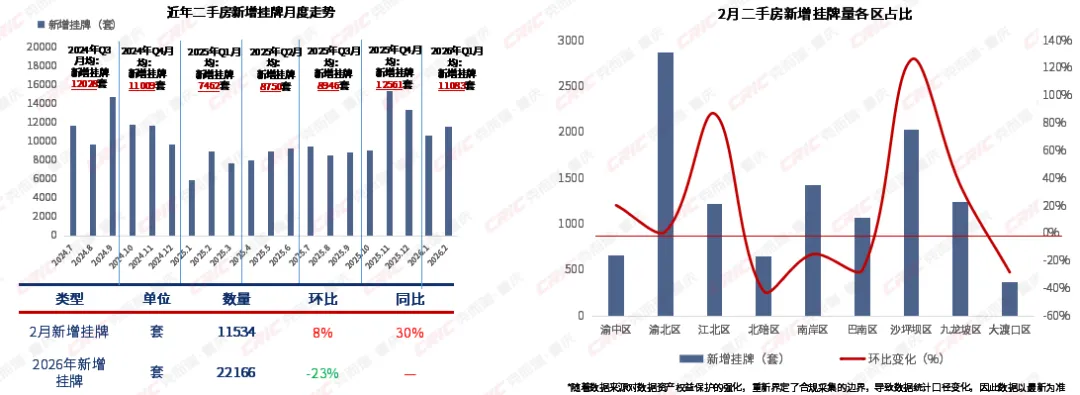 新增挂牌:重庆二手房新增挂牌房源11534套,短期业主出货意愿回升,2月供给放量;