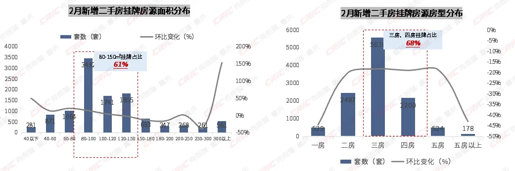 房源面积分布:80-150㎡是新增挂牌的绝对主力,占比61%,其中300㎡以上豪宅房源挂牌量明显上涨;