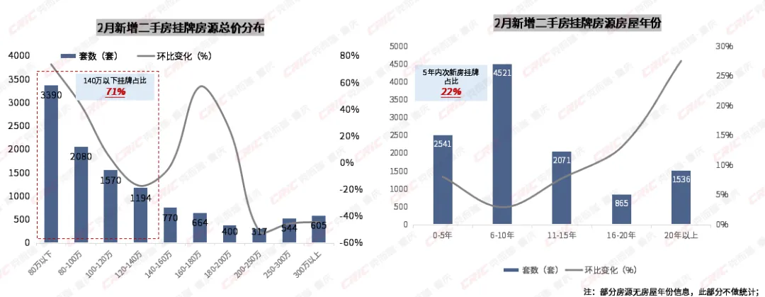 房龄分布:20年以上老房环比增幅接近30%,0-5年次新房环比也呈正增长,而6-15年中期房龄环比为负,说明老房业主变现意愿增强,次新房流通加速。
