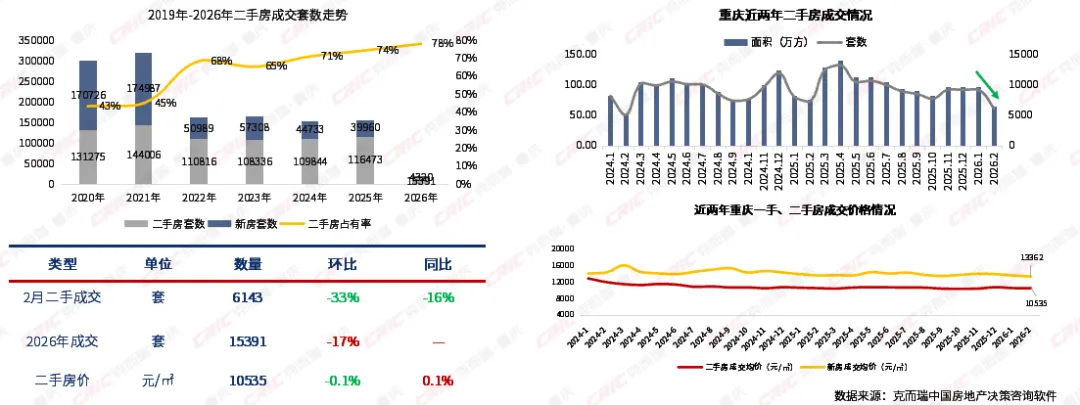 重庆二手房成交占比持稳,春节假期影响导致量价齐跌,但存量市场主导格局确立。