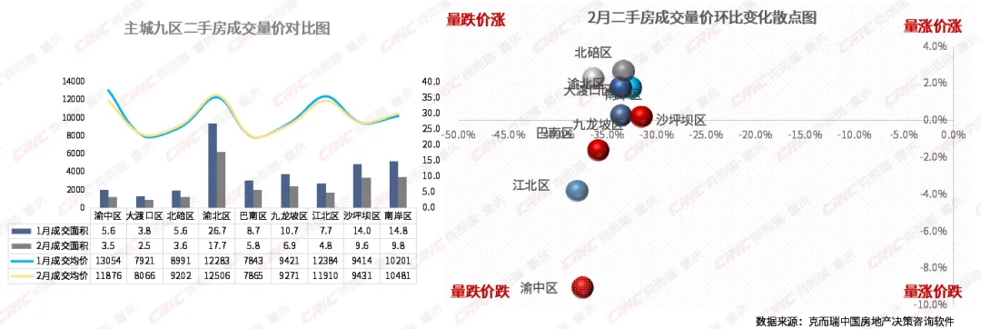 区域分布:受春节假期影响,各区域成交普跌,北碚、渝北等多数区域呈现量跌价涨;