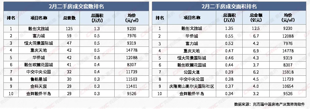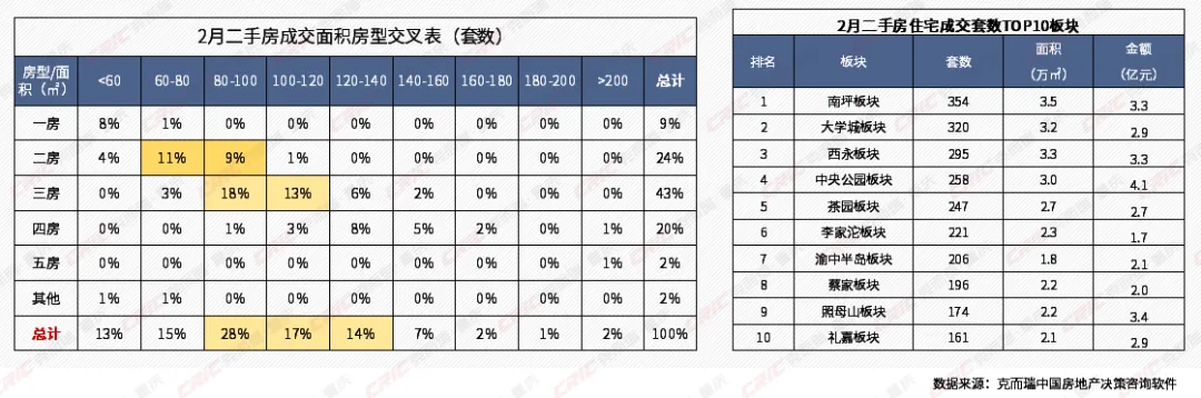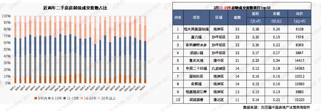 挂牌:二手房市场挂牌量同比涨1.5%,卖方竞争加剧,买方议价权提升;新增挂牌刚需盘托底,改善与老房加速出清,中高总价段房源卖家调整预期。 成交:重庆二手房成交占比持稳,春节假期影响成交量价齐跌,但存量市场主导格局确立。 成交结构:“刚需/首改”的实用户型主导;中期房龄房源是重庆二手房市场的“压舱石”。 热销项目:呈现“刚需大盘托底成交套数,核心改善贡献面积与金额”的二元结构。