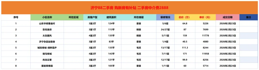 >济宁二手房成交市场价参考|2月23日