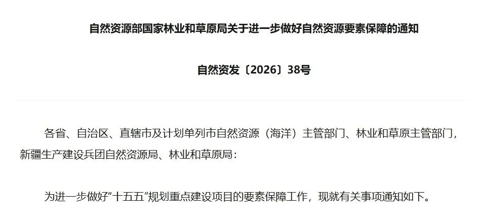 近日,自然资源部、国家林业和草原局联合印发的《关于进一步做好自然资源要素保障的通知》(自然资发〔2026〕38号)