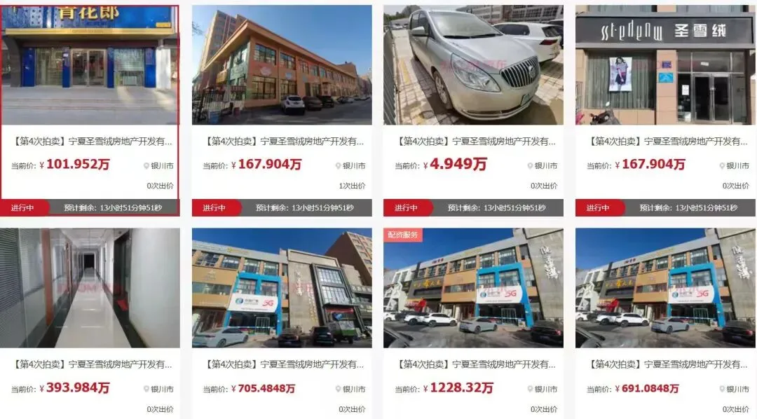 如今,圣雪绒的家底被拆成碎片摆上拍卖台:银川核心地段的写字楼评估价超千万,沿街商铺百万起拍,就连一辆别克轿车也以4.949万的价格挂牌。从几千块的汽车到上亿的地产,从驰名商标到破产资产,圣雪绒的三十年,像极了一代宁夏民营企业的缩影——抓住时代红利崛起,却在多元化扩张和行业周期中折戟沉沙。