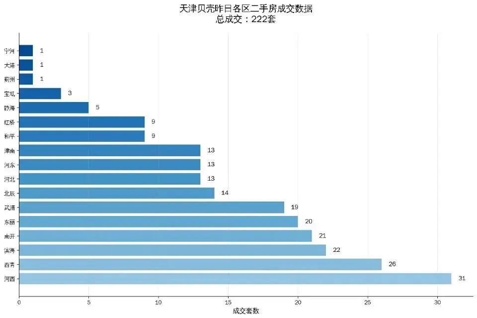 🏠 3月13日 天津二手房成交分析 总成交:221 套 🔥 热门板块(成交TOP5) 1. 河西 31套 —— 热度最高,改善需求坚挺2. 西青 26套 —— 近郊刚需主力3. 滨海 22套 —— 区域成交量稳定4. 南开 21套 —— 核心城区持续走量5. 东丽 20套 —— 性价比板块受欢迎