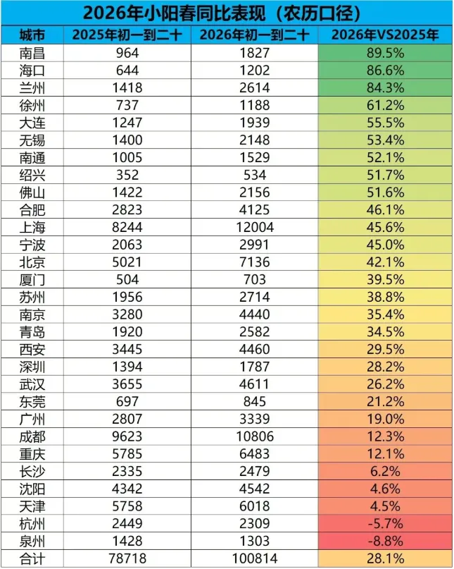 先看最硬核的实时成交——楼市日历冰山大数据,截至2026年正月初一至二十(3月8日),29城实时成交量同比暴涨28%,小阳春全面爆发,没有丝毫水分。