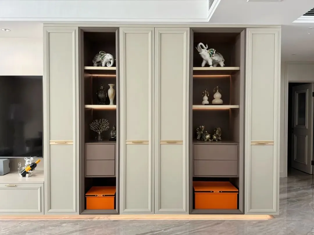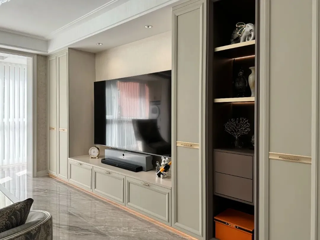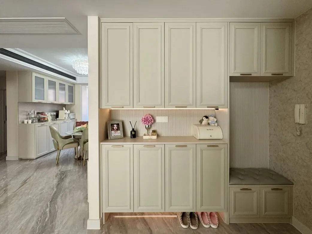 考虑到二手房入户空间的利用率,我们定制了法式通顶玄关柜,柜体线条柔美,搭配精致的金属拉手与简约法式雕花点缀,既保持视觉整洁,又彰显高端格调,内部划分清晰的收纳区域,可妥善存放鞋子、包包、钥匙等日常物品,实现“藏而不露”的收纳逻辑,
