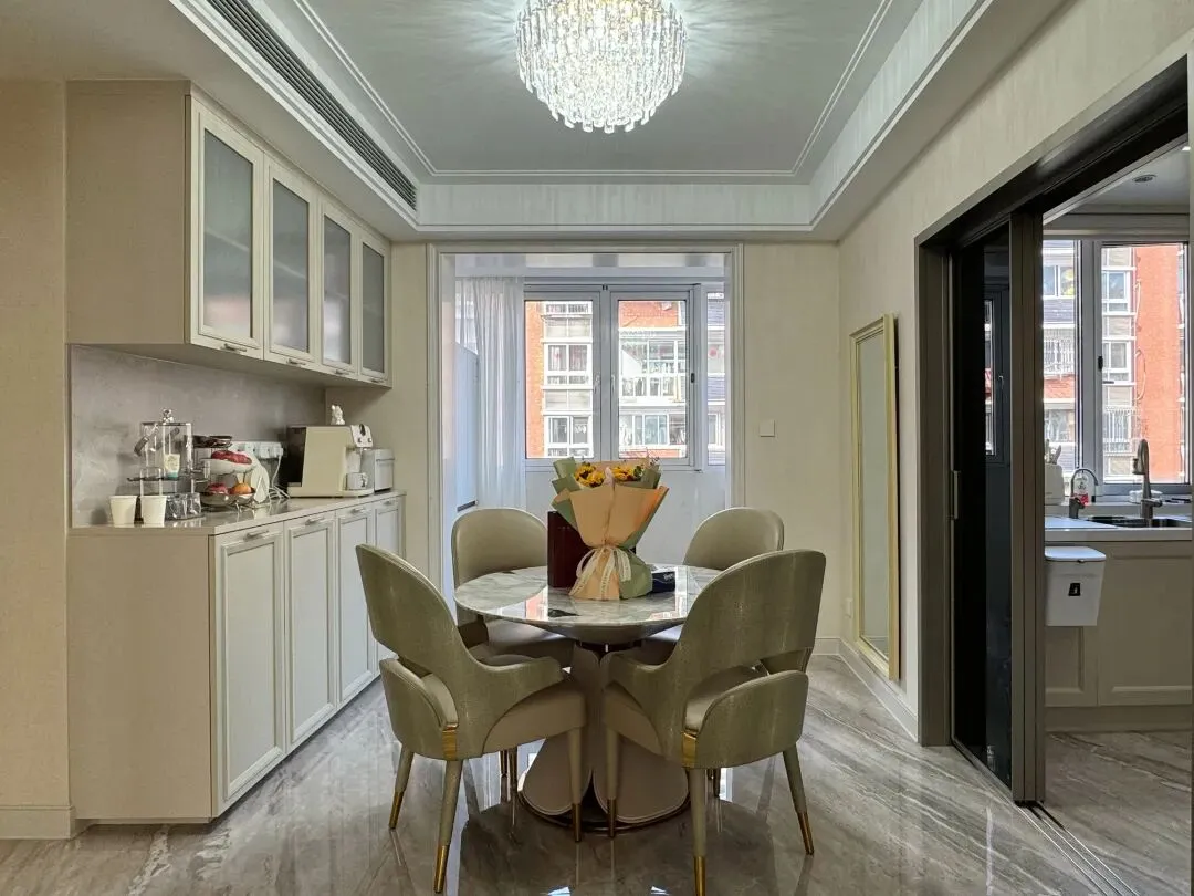 餐厅与厨房无缝衔接,动线流畅合理,适配日常烹饪与用餐需求。法式轻奢餐桌搭配精致餐椅,线条柔美、质感出众,餐边柜采用法式造型设计,让烟火气与浪漫感完美融合,每一处都透着高端酒店般的精致格调。
