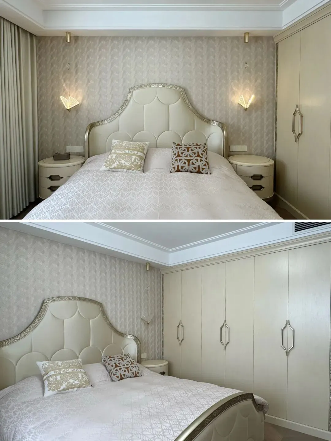 主卧以“浪漫温馨、静谧舒适”为核心,低饱和度的柔和色调搭配细腻的法式石膏线条,搭配高端软包床头,触感温润、格调出众,嵌入式法式衣柜最大化利用空间,保持视觉整洁,搭配精致的金属拉手,细节处彰显轻奢质感,让每一段休憩时光,都充满温柔与惬意。