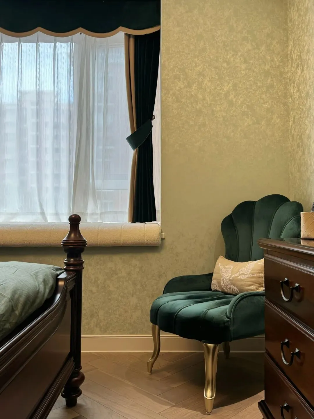 次卧作为父母房,延续整体法式轻奢调性,兼顾长辈居住的舒适便捷与高端审美,考虑到长辈日常居住的便利性,空间布局简洁通透,动线流畅无阻碍,避免繁琐装饰带来的压抑感。