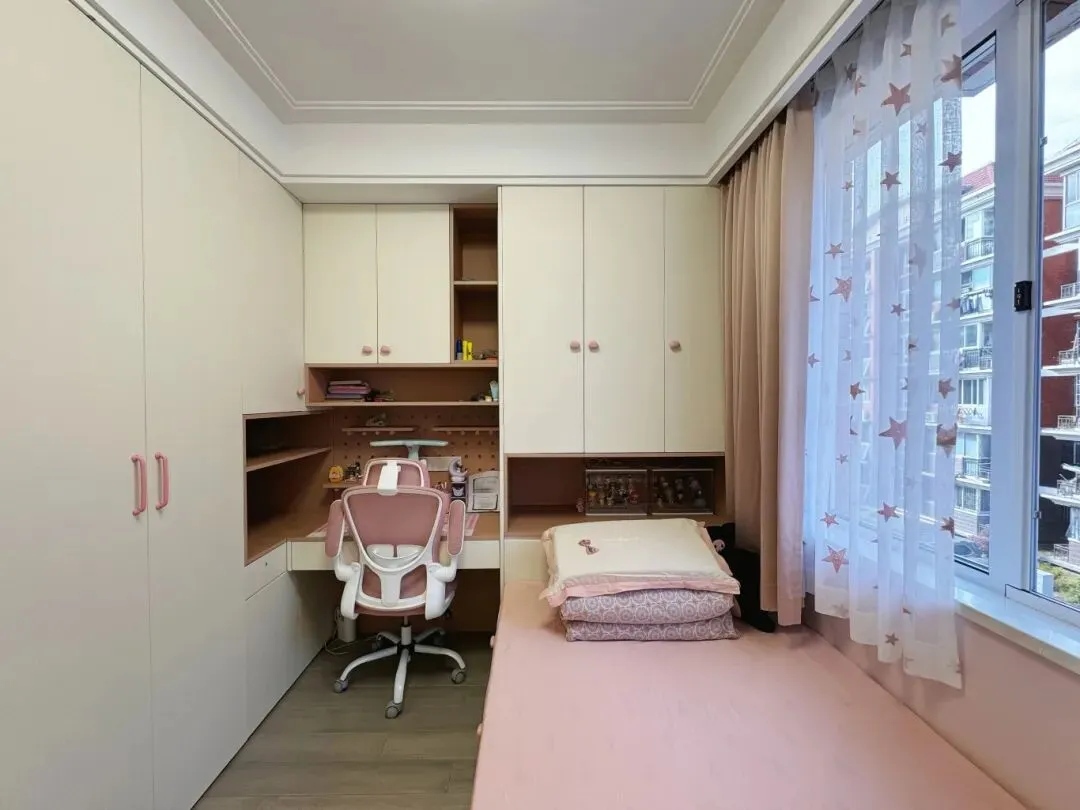 定制衣柜、书桌与榻榻米一体化设计,区域划分清晰,可以培养孩子的收纳整理的习惯。软糯地床品,营造出温馨治愈的休憩氛围;让孩子在浪漫雅致的粉色空间中快乐成长。