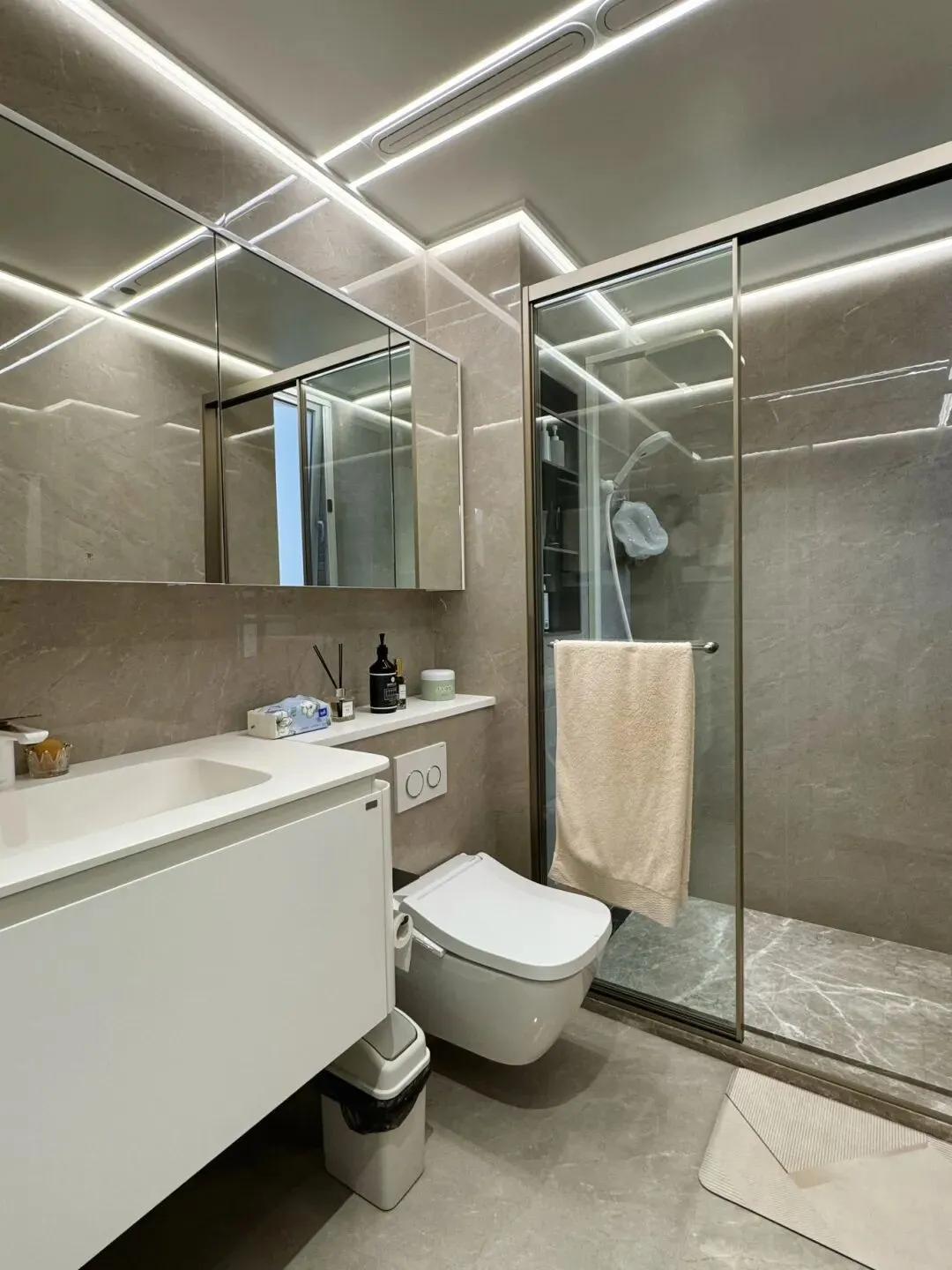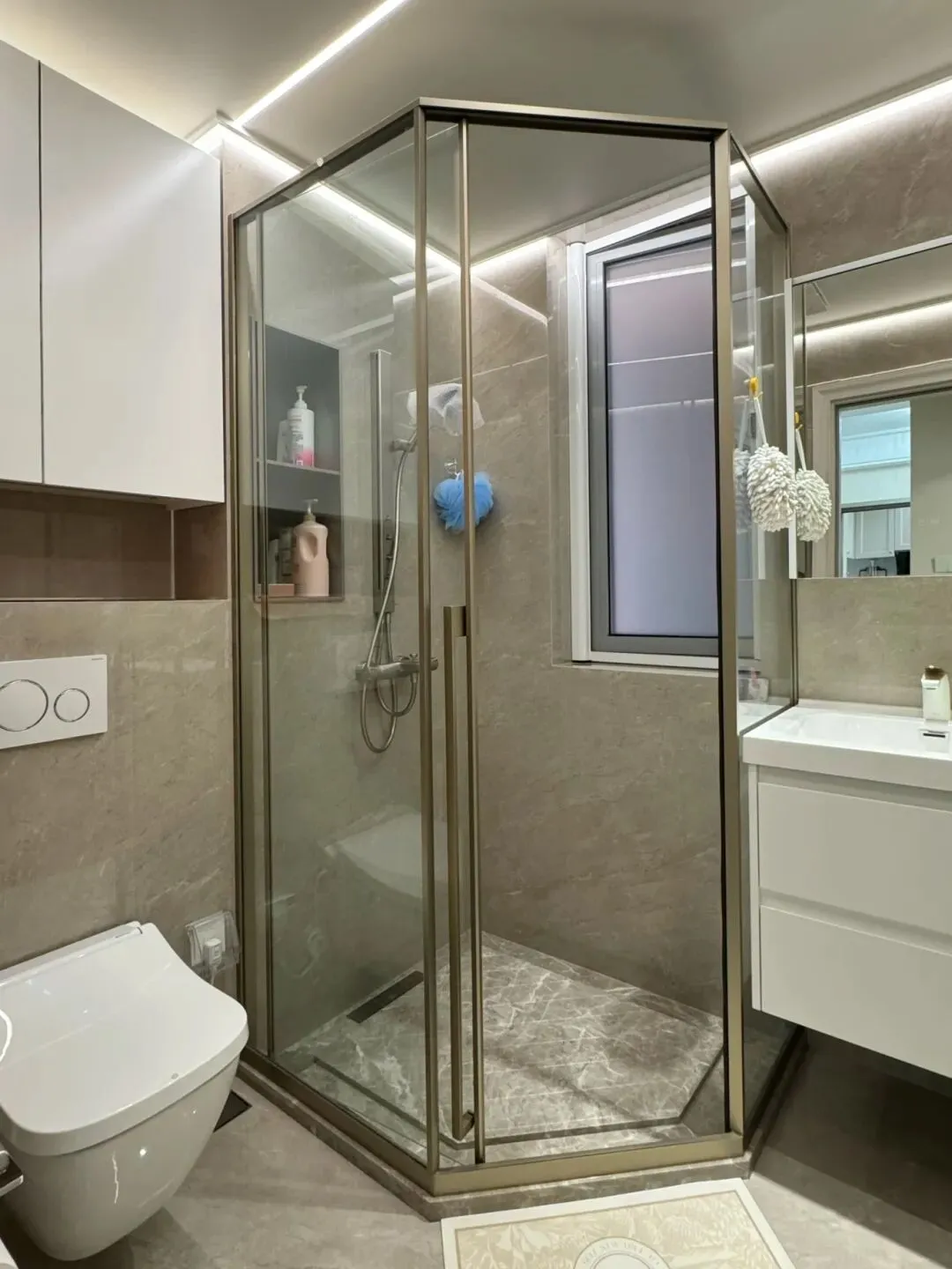 两个卫生间均采用干湿分离设计,彻底解决二手房卫生死角问题。选用高端防滑瓷砖,搭配法式轻奢洁具,定制浴室柜与镜柜,妥善收纳洗漱用品,既好打理、显整洁,又能彰显高端质感。