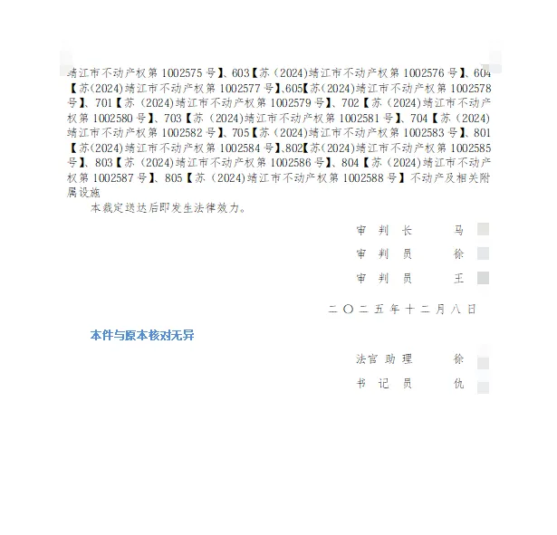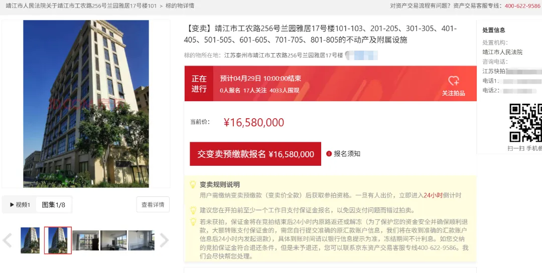 据靖江市人民法院的执行裁定书中显示:被执行人江苏**家置业有限公司因金融借款合同纠纷一案中未履行相关义务,遂其名下的该处房屋被上架拍卖。