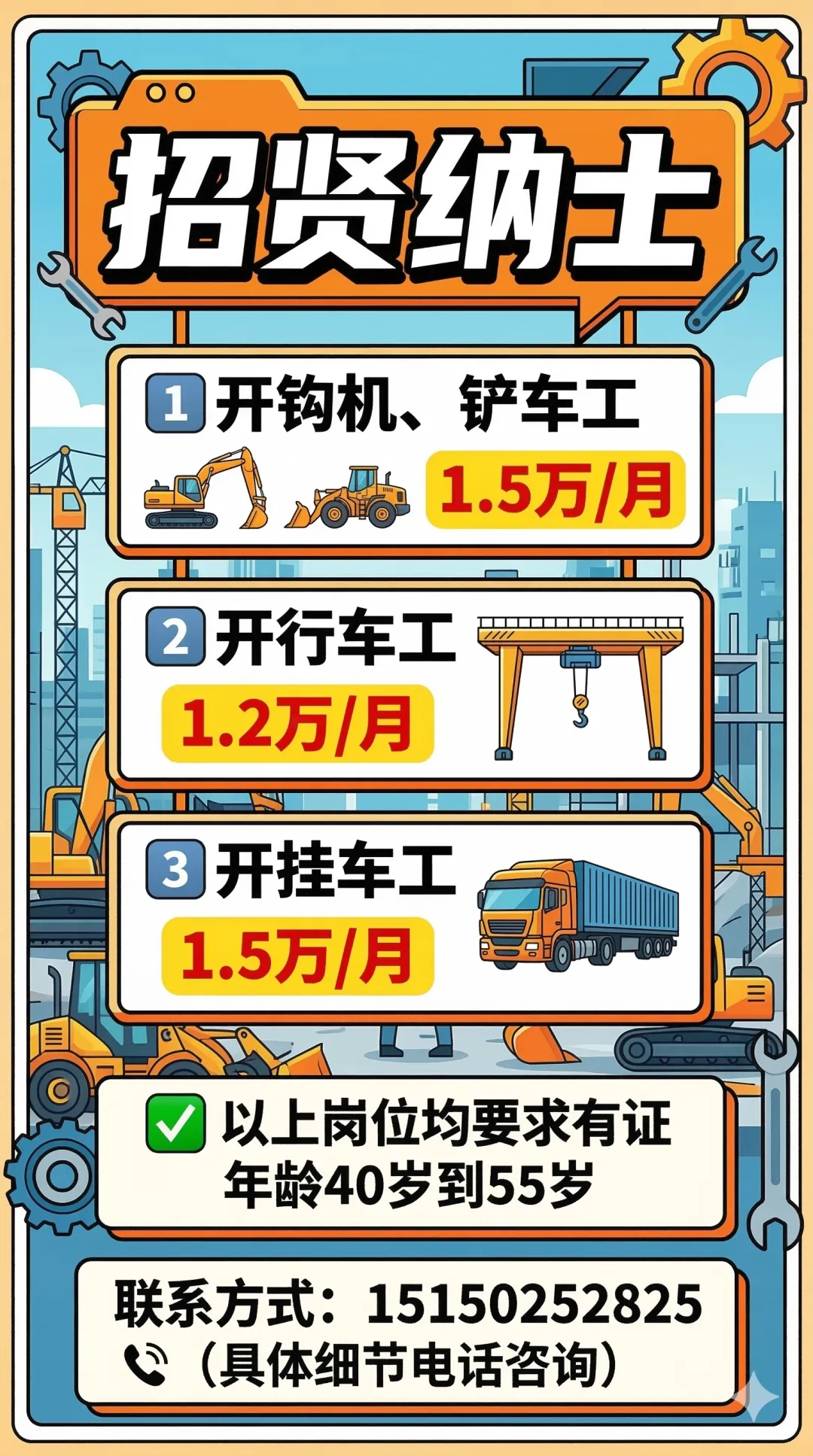 1️⃣开钩机、铲车工,1.5万/月