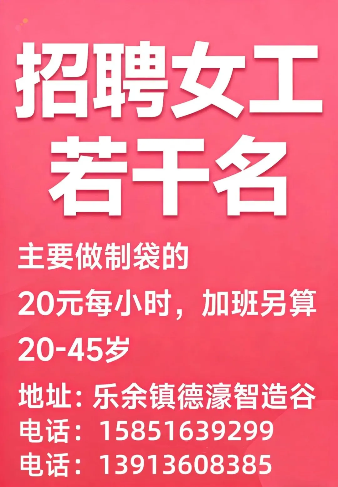 【招聘岗位】女工若干名