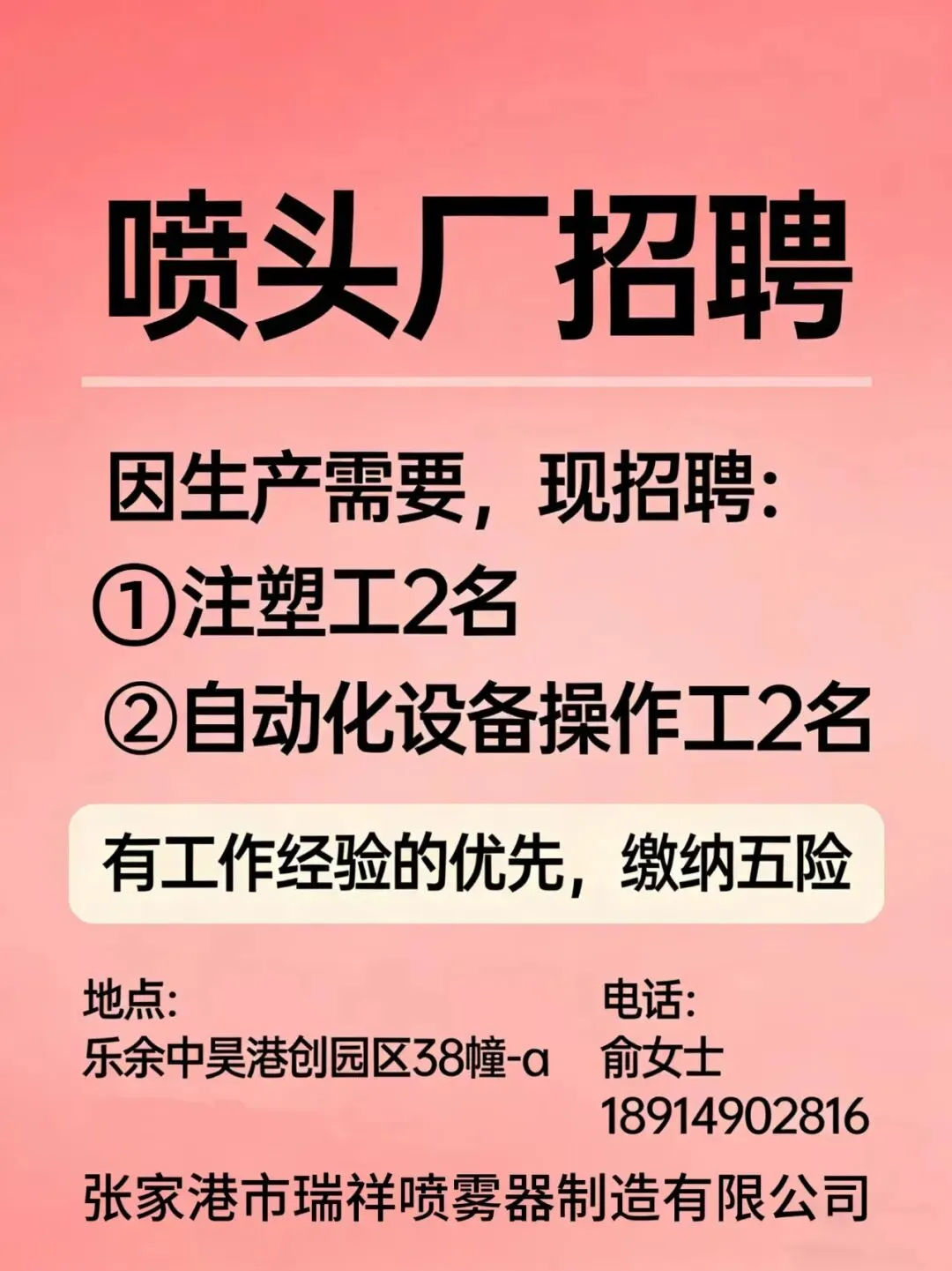 【工作地点】乐余中昊港创园区38幢-a (张家港市瑞祥喷雾器制造有限公司)